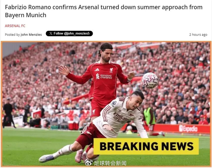 罗马诺在YouTube频道中表示,拜仁今夏曾尝试收购马丁内利,但阿森纳不愿意在德甲豪门的估价上放人。