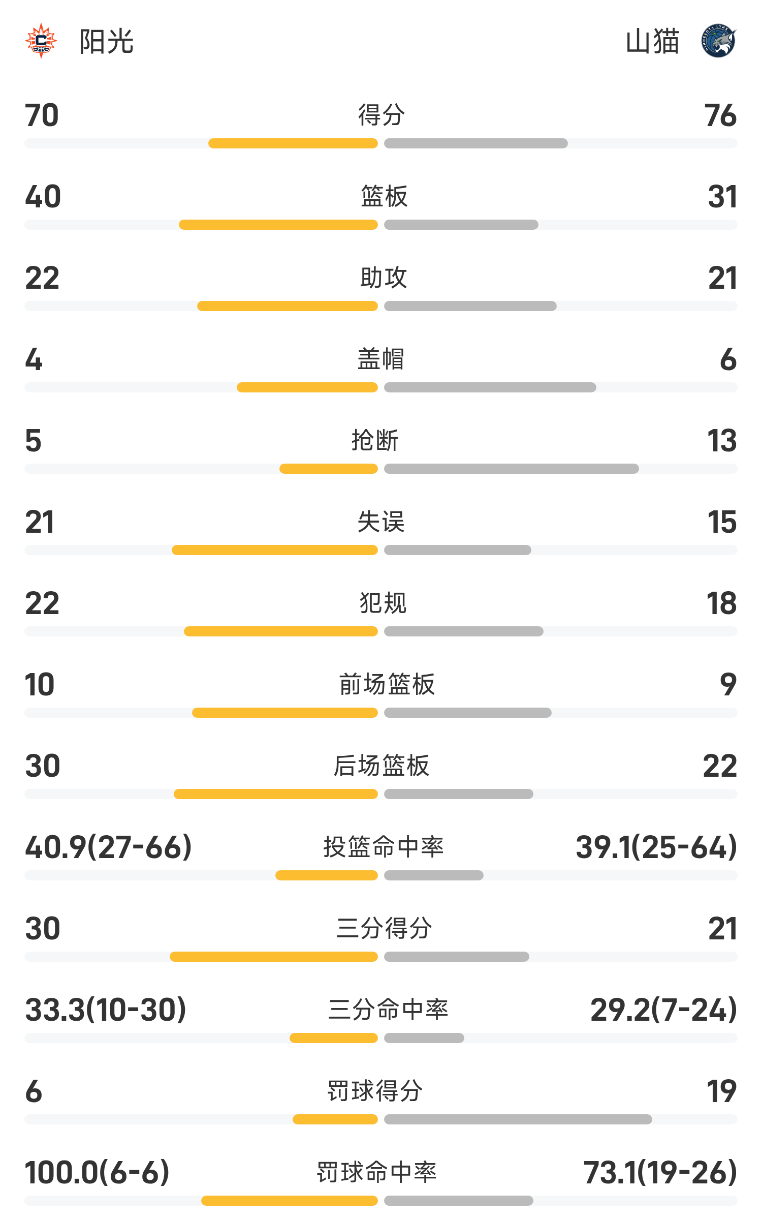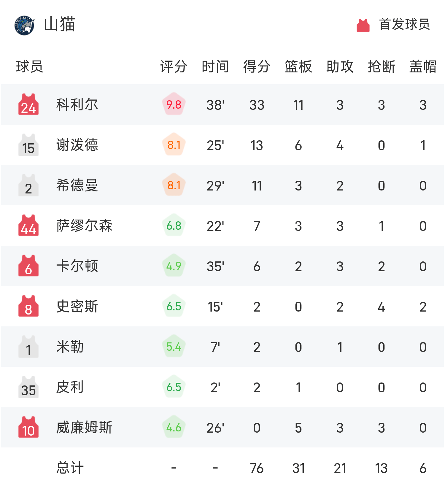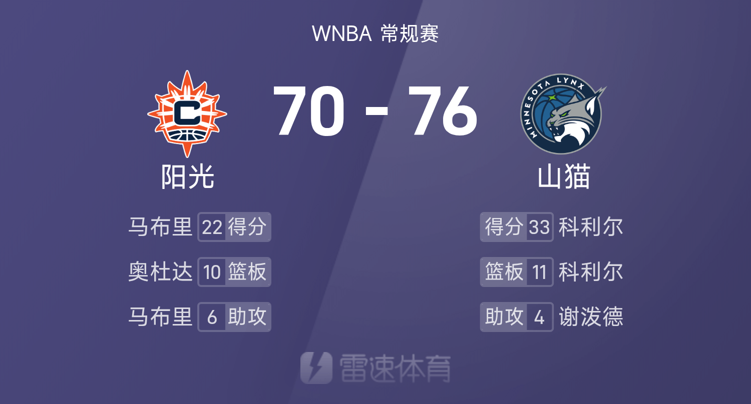 05月24日讯 25赛季WNBA 常规赛,山猫对阵阳光。双方全场战罢,山猫76-70战胜阳光。科利尔砍下全场最高的33分11板3助,率领山猫成功取胜。